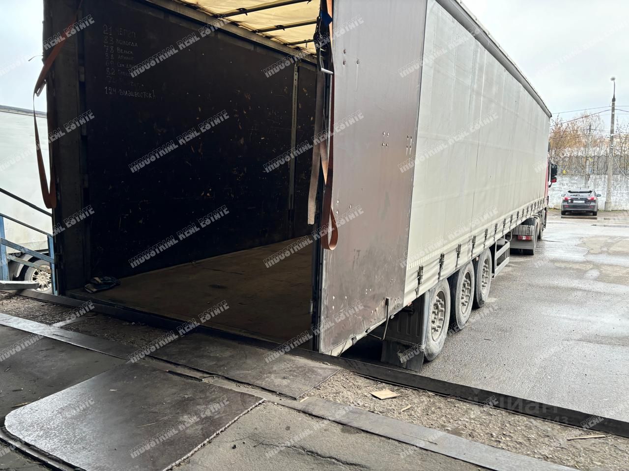 Крытый широкий пандус под разгрузку/погрузку на уровене 1.20м, подъезд фур, ворота на пандусе.