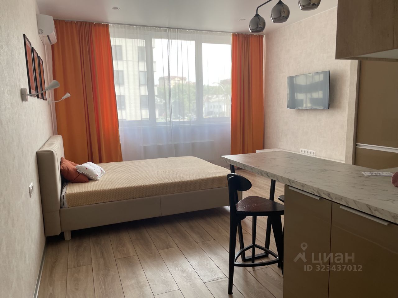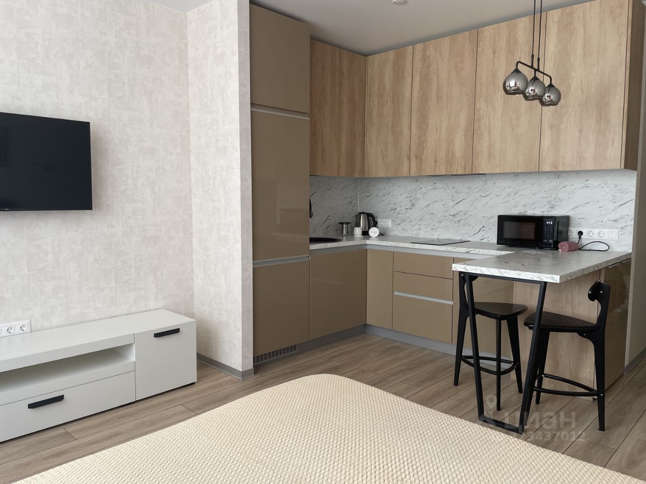 Стильная студия, оснащенная всем необходимым для проживания.