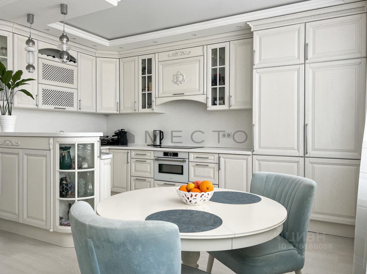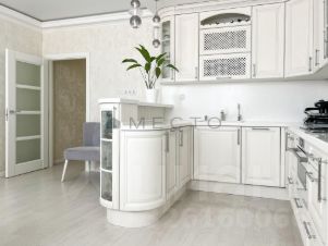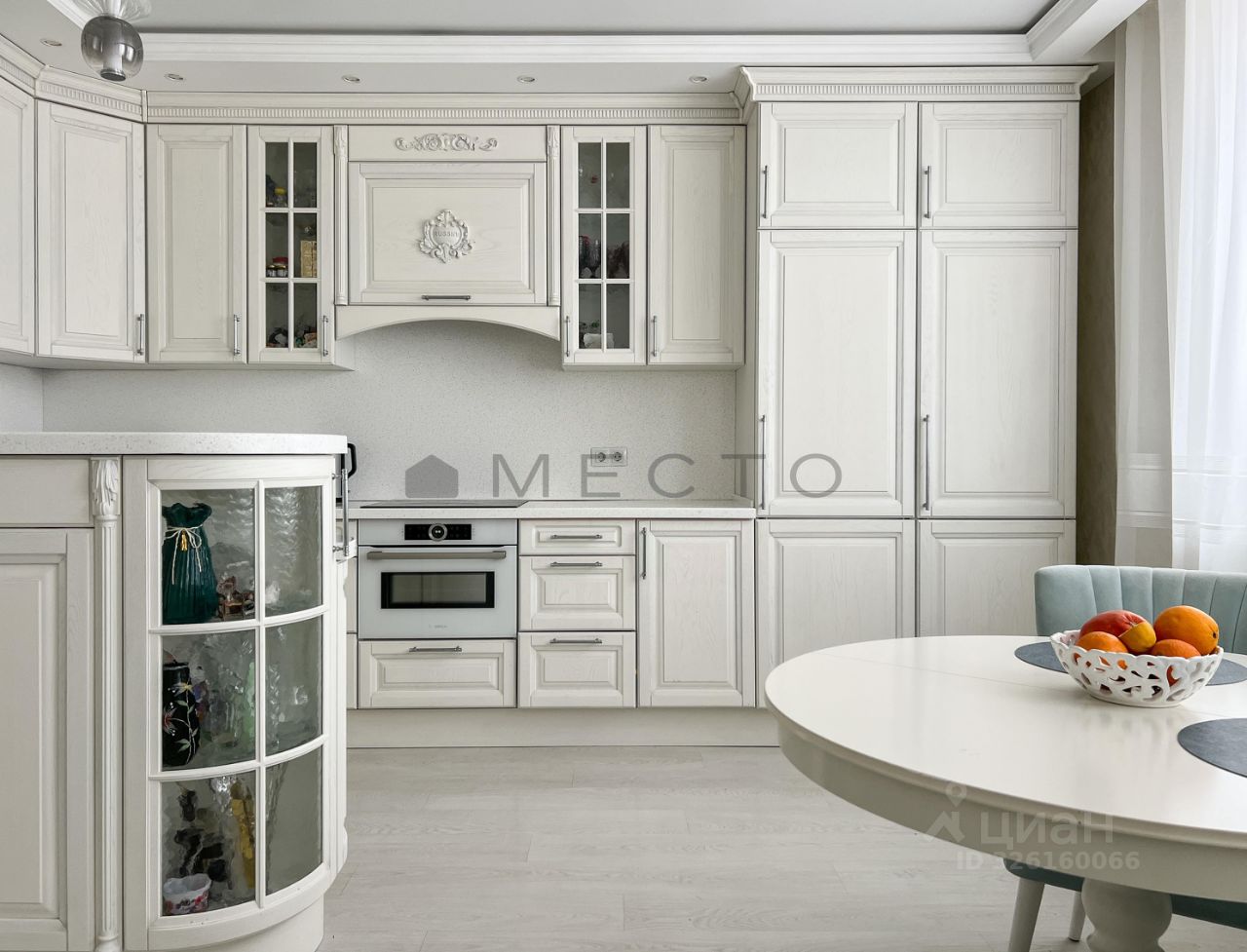 Кухня-гостиная 21,4м2 с кухонным гарнитуром из массива дерева. Холодильник и морозильная камера - Liebherr. Варочная панель, духовой шкаф совмещенный с СВЧ - Bosh.