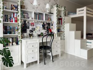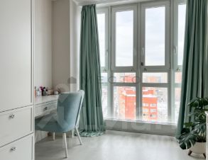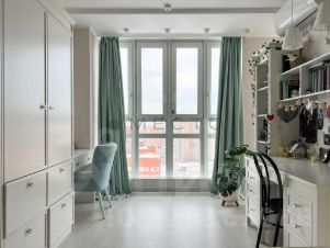Детская комната 13,1 м2 с панорамным остеклением и качественной мебелью, изготовленной на заказ. В комнате есть двухъярусная кровать, большой шкаф и два рабочих места для проживания двух детей.