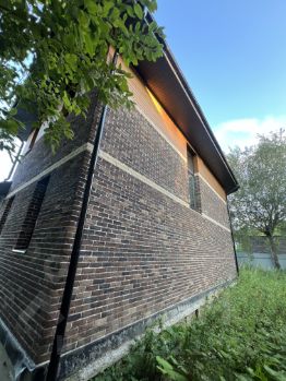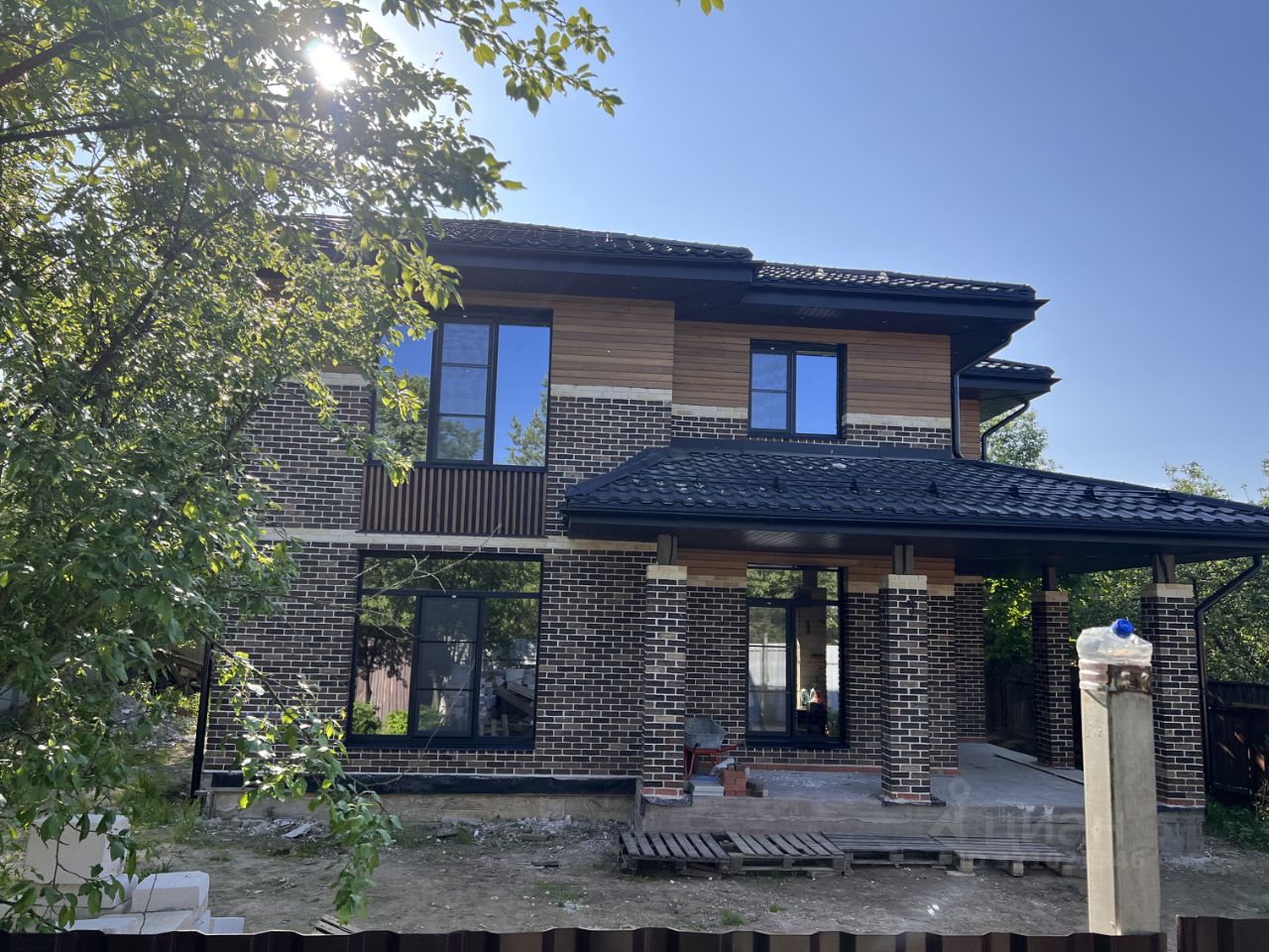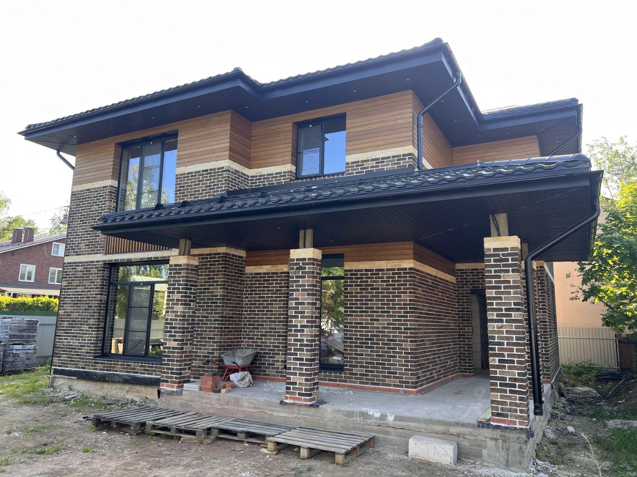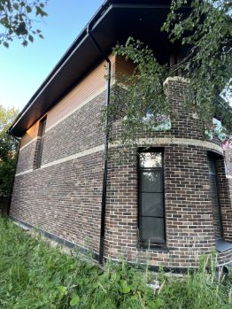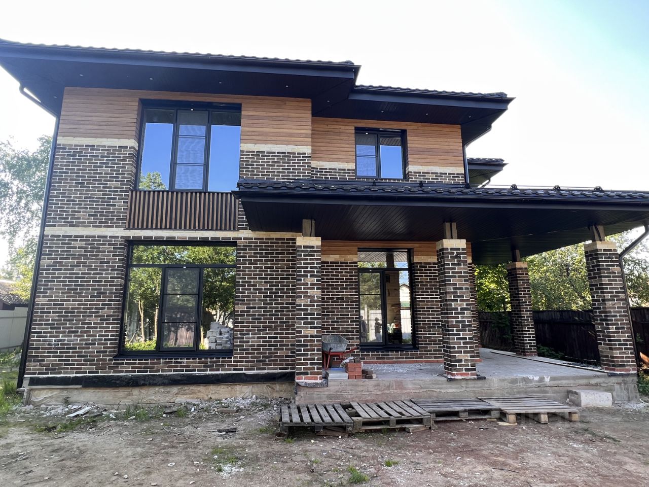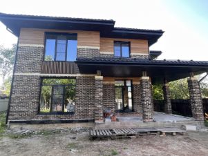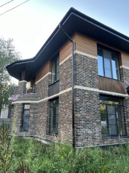 Стены: газобетон 375 мм + утеплитель 50 мм + вент. зазор + облицован кирпичом ручной формовки и планкеном из лиственницы;